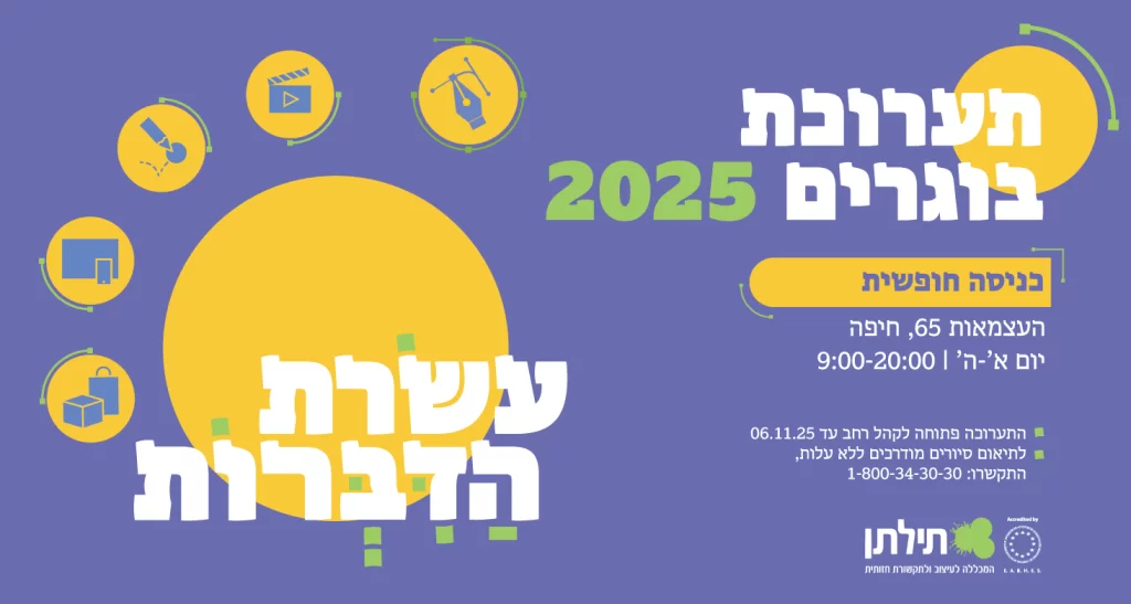 היום הפתוח בתילתן מהווה למעשה היכרות ראשונה עם סביבת המכללה – הן עם הסביבה הלימודית והן עם הסביבה האורבנית במתחם קמפוס הנמל בחיפה. בנוסף להסבר על המסלולים הקיימים בתילתן, נערוך סיור מקיף במכללה שבמהלכו ניקח אתכם למסע בעולם העיצוב של תילתן – דרך מגמות וכיתות הלימוד, חממות הפיתוח והעבודה, מרתף המכללה אשר מהווה נקודת ציון […]